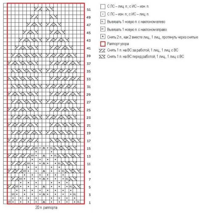 Первые 3 ряда вязать лицевыми петлями. В итоге, мы получим два рубчика платочной вязки. Далее, переходите на вязание кромки по схеме. Распределяйте узор от центральной петли, чтобы рисунок выглядел одинаково с обоих краев изделия.