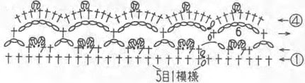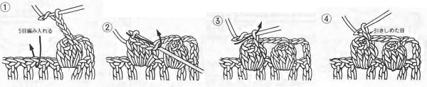 Основной узор: вяжем 5 недовязанных столбиков с накидом, а затем их провязываем вместе. Получается мягкая шишечка. Она идет в одном ряду с основным узором и не выпирает из общей картины рисунка.