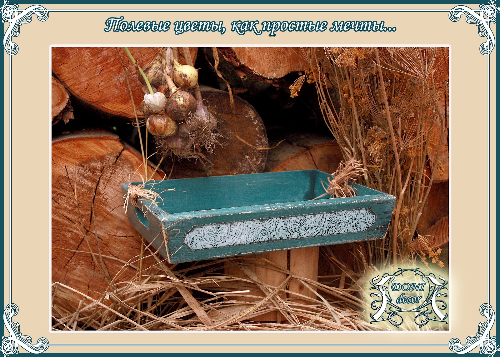 Материалы: Заготовка деревянная подноса. Грунт, клей-лак для декупажа, акрил. краски, свечка, шкурка, кисти, распечатки, мордан + гуммиарабик, пастель, порпорина, контур "серебро", лак.