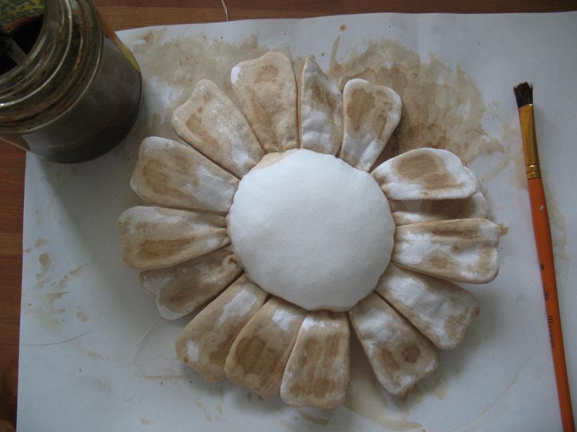 Красим ромашку раствором кофе-корица-какао-ПВА (как сделать раствор можно прочесть в МК по котам примитивам), красим серединку...