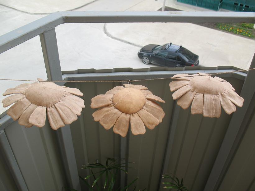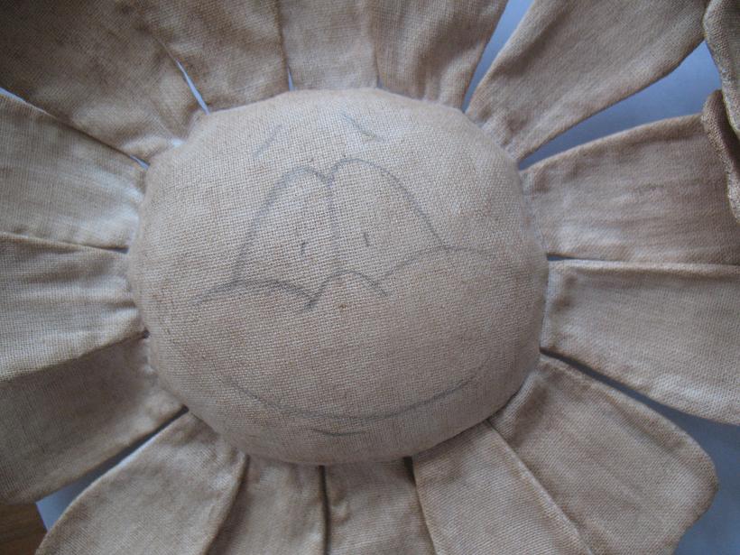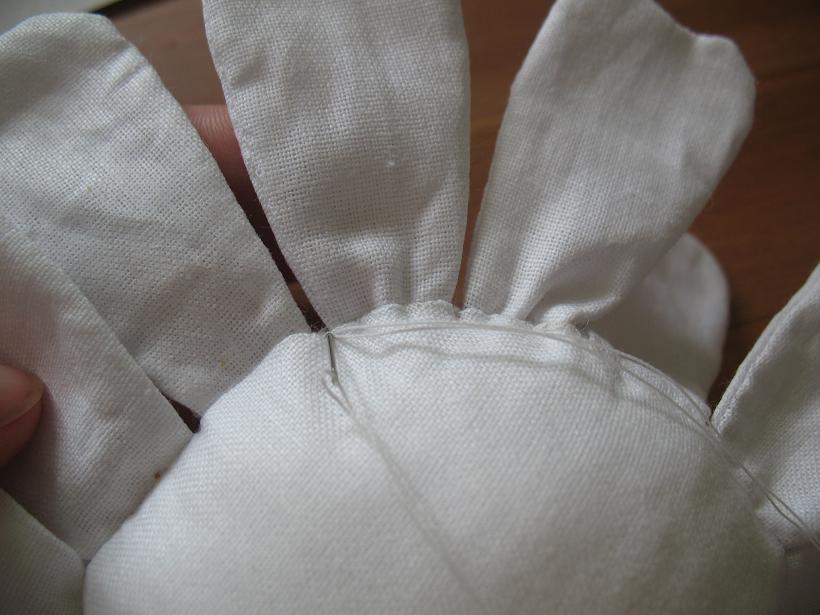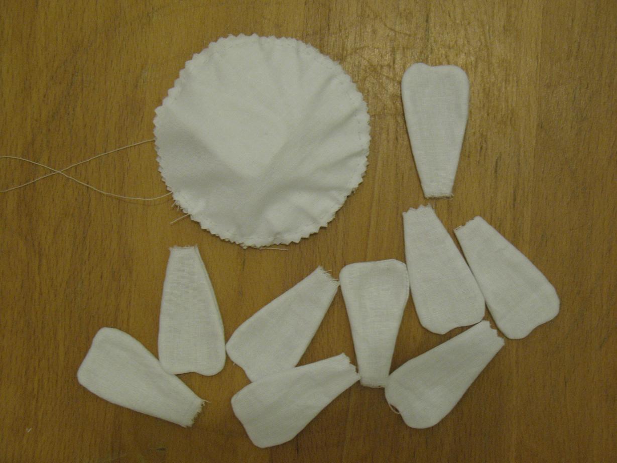 К сожалению фото раскроя у меня нет.. но там все просто, складываем ткань пополам (я использую плотную Гостовскую бязь), обводим 15 лепестков, лепестки сшиваем оставив место для выворачивания не зашитым (на выкройке оно обозначено пунктиром), обводим круг- нашу будущую сердцевину ромашки, скалываем посередине булавочкой чтоб нижняя ткань не съезжала и вырезаем (НЕ СШИВАЕМ!!!) оставив припуски 0,5 см. Я все вырезаю ножницами зигзаг, у кого их нет не забудьте сделать надрезы чтоб ткань не стягивалась после выворачивания.