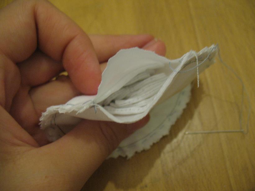 Берем иголочку с ниткой и начинаем наметывать, вкладываем лепестки между двумя кругами, ровняем краешки и прошиваем захватывая все 4 слоя ткани, лепестки укладываются внутри как веер, следите чтоб между лепестками (в месте сшивания) был отступ примерно1-2мм.