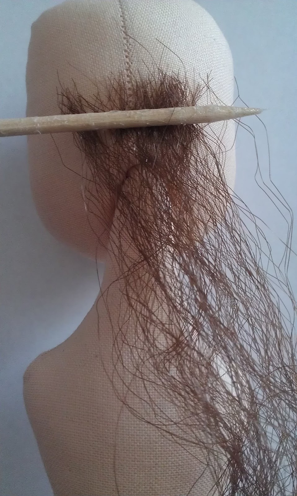 Девочки, я начинаю клеить с затылка по направлению к вискам, мне так удобнее. Обильно намазываю клеем голову куклы, т.е. то место, куда клею прядь, прикладываю прядь, распределяю равномерно, чтобы все волосы проклеить и фиксирую. Важно знать - если несколько раз прижимать палочкой волосы, отпускать, опять прижимать, то клей, оставшийся на палочке, будет прилипать к волосам, образуя белые катышки, а это нам совсем не нужно).