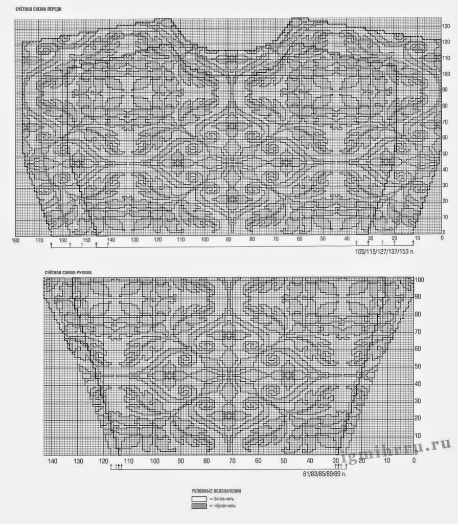 Жаккардовые узоры: вязать лиц. гладью по счётным схемам, свободно протягивая нерабочую по изн. стороне изделия.