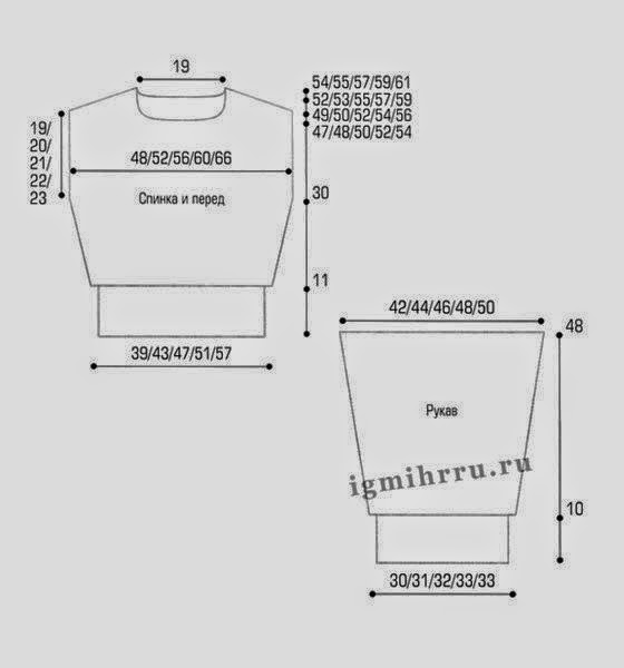 Спинка: спицами № 3 чёрной набрать 92/102/114/124/140 п. и вязать резинкой 1х1. Через 11 см от наборного края перейти на спицы № 3,5 и продолжить работу белой нитью, при этом равномерно убавить в 1-м p. 3/3/5/7/9 п. = 89/99/109/117/131 п. Одновременно прибавить с обеих сторон в каждом 6-м р. 7 х 1 п., в каждом 4-м р. 3 х 1 п. = 109/119/129/137/151 п. Затем вязать прямо. На высоте 49/50/52/54/56 см от наборного края закрыть для скосов плеч с обеих сторон в каждом 2-м р. 1 х 5 п., 7 х 4 п./ 6 х 5 п., 2 х 4 п./ 3 х 6 п., 5 х 5 п./ 7 х 6 п., 1 х 5 п./ 6 х 7 п., 2 х 6 п. Одновременно через 52/53/55/57/59 см от наборного края закрыть для выреза горловины средние 17 п. и вязать далее раздельно, закрывая по краям выреза в каждом 2-м р. 1 х 13 п.