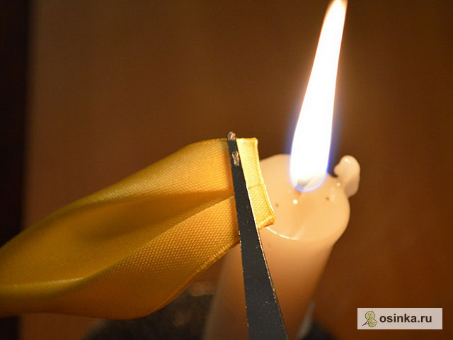 Совет: чтобы копоть от пламени свечи не попала на ленту, оплавлять лучше всего прямо у фитиля, а не у верхушки пламени.