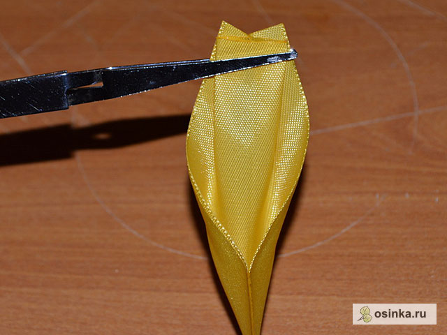 06. Когда складочки сделаны, и форма лепестка меня устраивает, обрезаю выступающие уголки. Затем зажимаю край лепестка пинцетом и оплавляю край над свечкой.