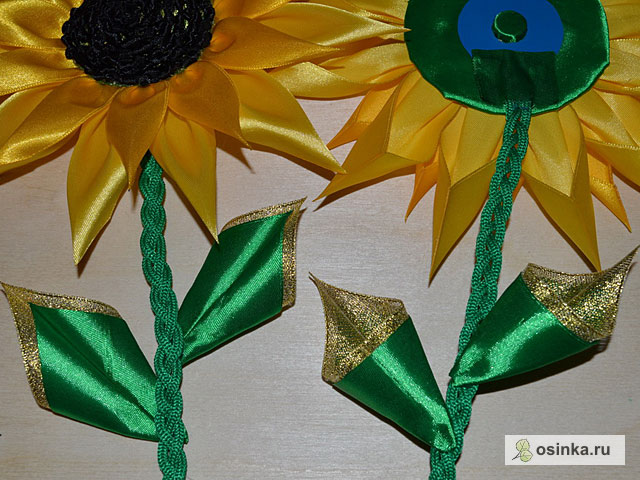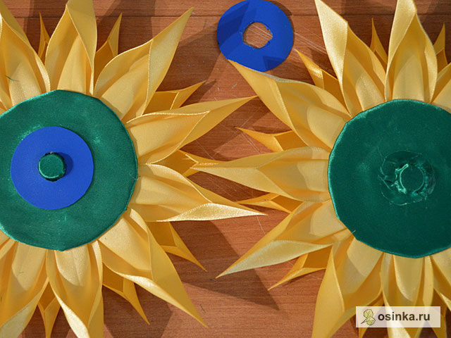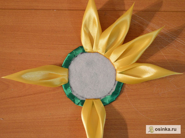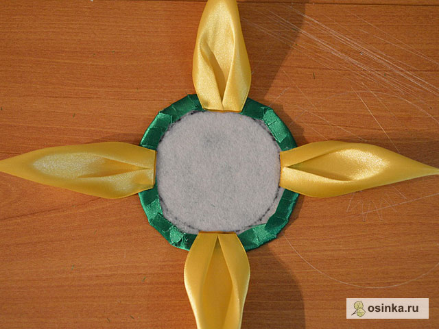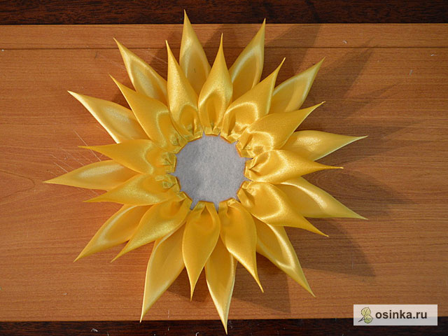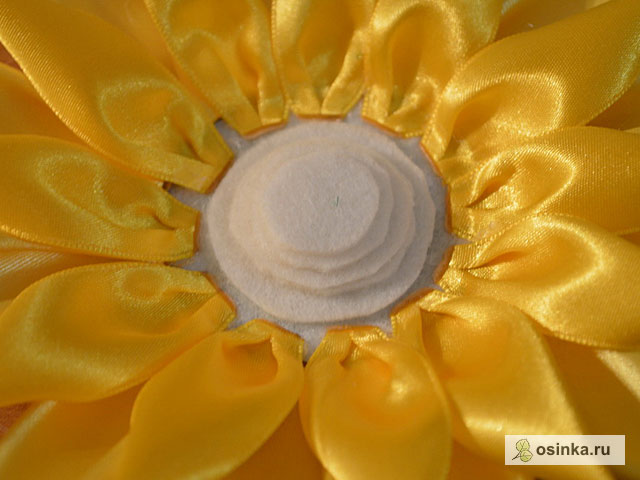 01. Сначала делаем цветок подсолнуха. Для большей реалистичности, по внутреннему кругу цветка, я пустила лепестки поуже (желтая лента - шириной 2,5см). Для наружного круга – лепестки пошире (желтая лента – шириной 5 см).