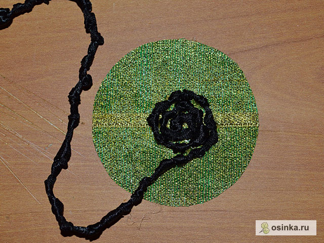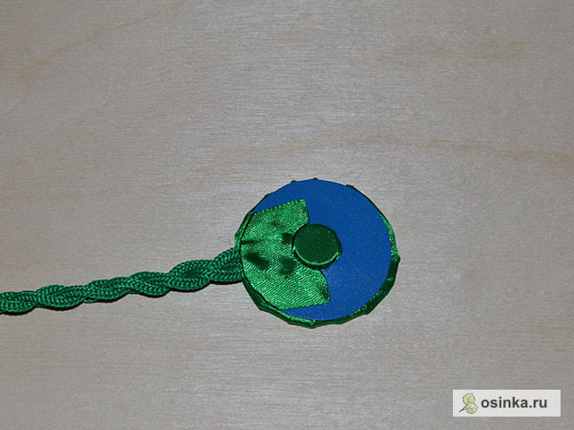 Затем, с помощью термопистолета, приклеиваю оба круга на полоску зеленой атласной ленты.