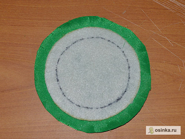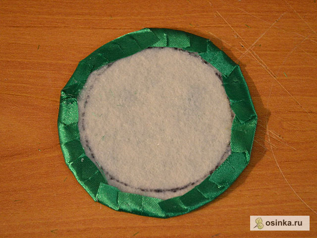 11. Теперь наношу термоклей на край круга из фетра. И загибаю ленту на фетр, прижимая ее.