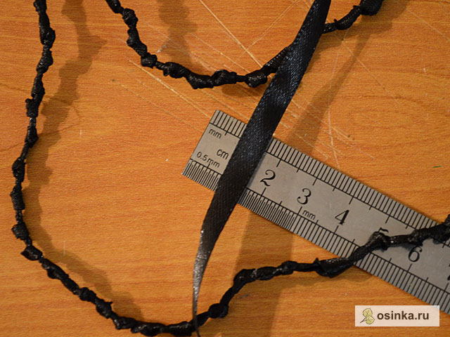 17. Теперь очередь за семечками. Мне довелось сделать уже несколько подобных подсолнухов. Для имитации семечек мне больше понравился следующий способ: берется узкая (0,5см) черная лента и на ней вяжутся частые узелки. У меня ушло 5 метров такой ленты, хватило только-только на два подхвата.
