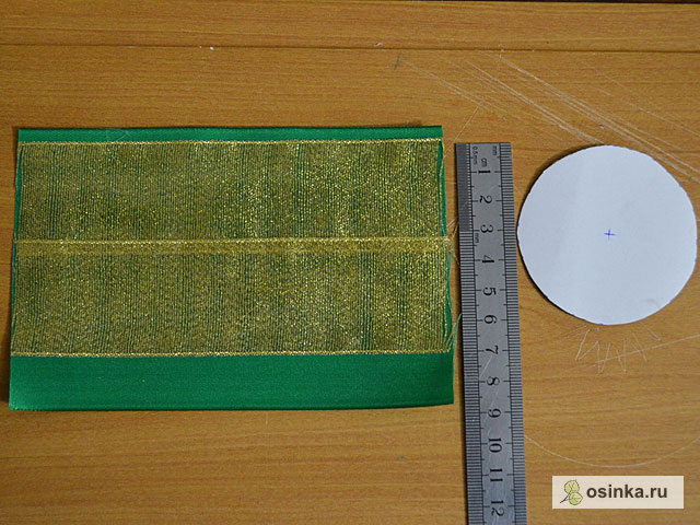16. Чтобы закрыть фетр и края лепестков, я сделала следующее: из бумаги вырезала круг - шаблон, который закрывал бы фетр и края лепестков. Затем, на зеленую ленту, шириной 10 см. приклеила две полоски золотистой ленты внахлест. Размер должен быть таким, чтобы на него поместились два круга – шаблона.