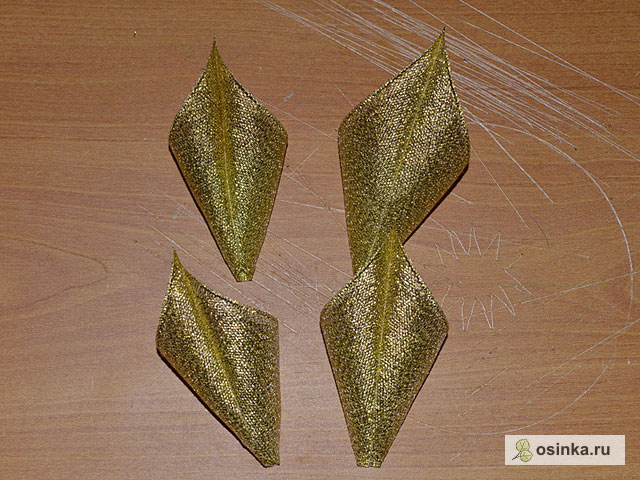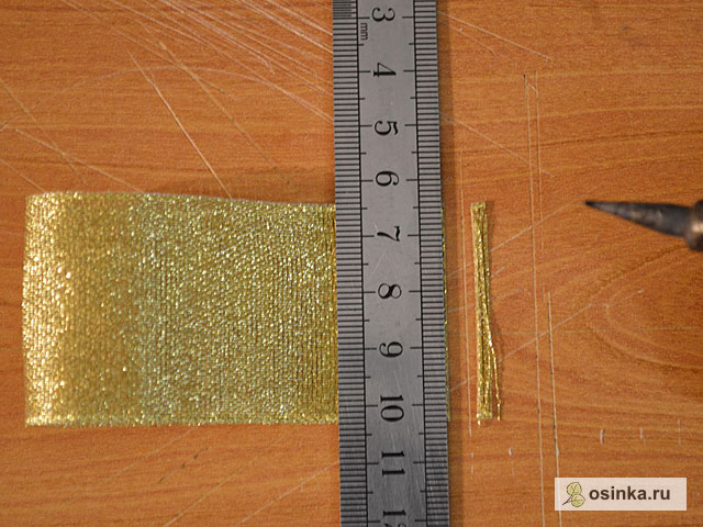 Вырезала с помощью паяльника. Зеленые листочки я сделала чуть меньше золотистых. Для того, чтобы золотистые выглядывали из зеленых. Поэтому полоски я вырезала не по 16 см, а по 14 см.
