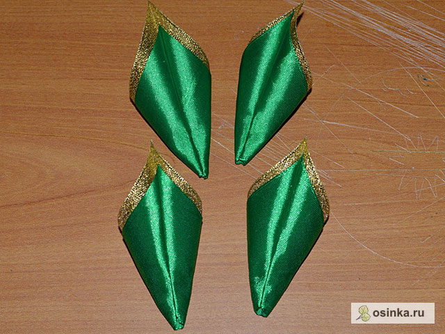 Листочки я сделала двойные, в сочетании зеленого и золотого. Из золотистой ленты заготовила 2 отрезка длиной 16 см. каждый.
