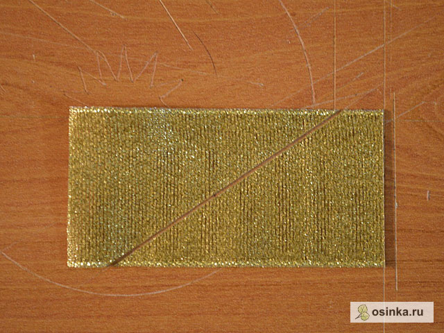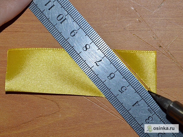 02. Теперь делаем лепестки. Складываем прямоугольник пополам, изнанка с изнанкой. Прикладываем металлическую линейку, как на фото и разогретым паяльником (или выжигателем), отрезаем уголок. А от высокой температуры, ткань спаивается.