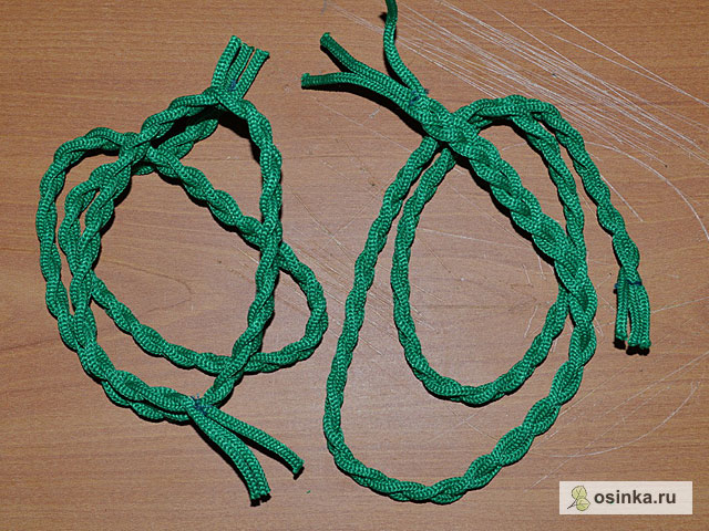 21. Из декоративного, зеленого шнура, сплела простую косичку. Разрезала пополам, получилось две штуки, по одной на каждый подхват. Чтобы косички не расплетались, концы сшила нитками.