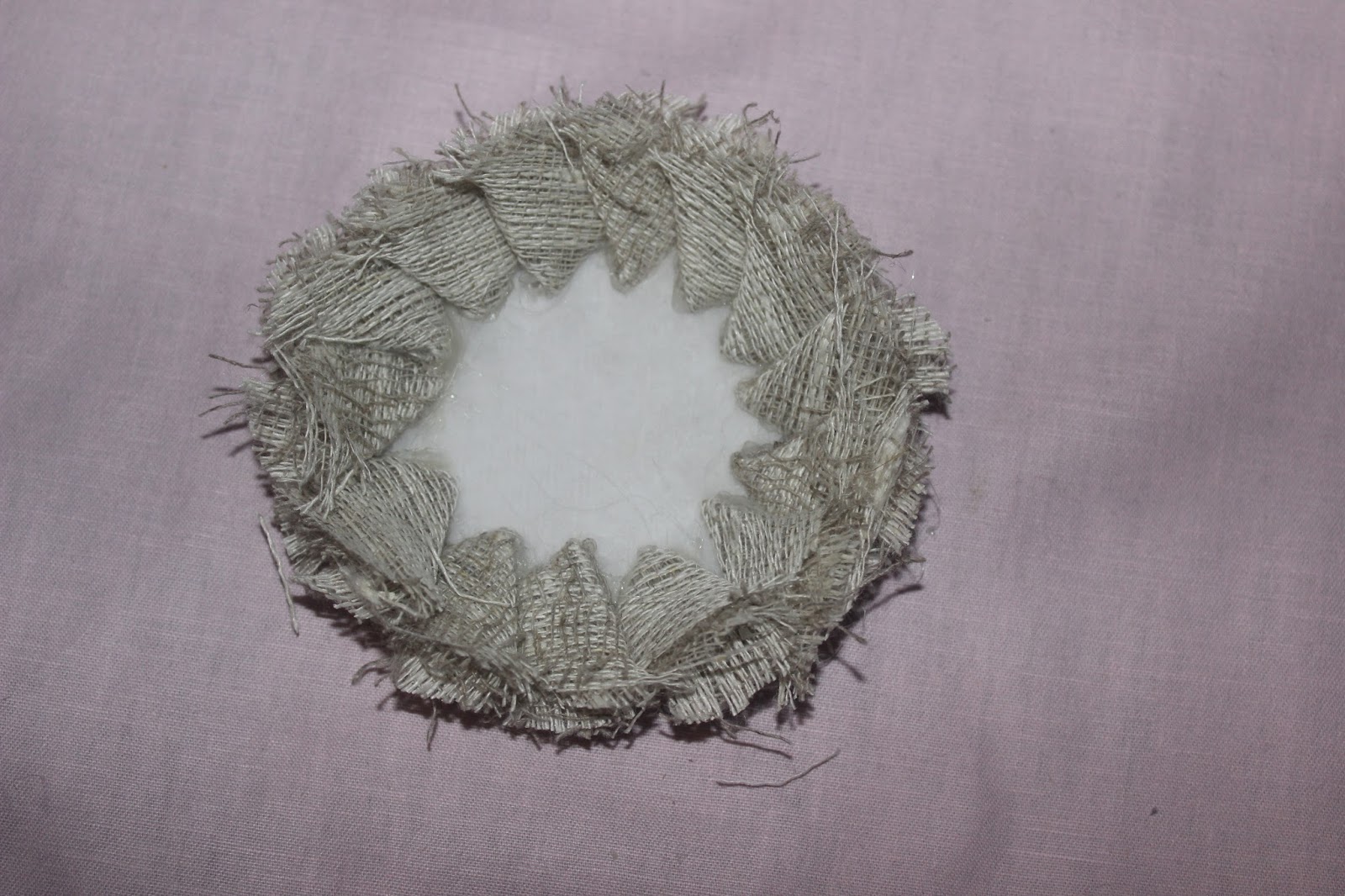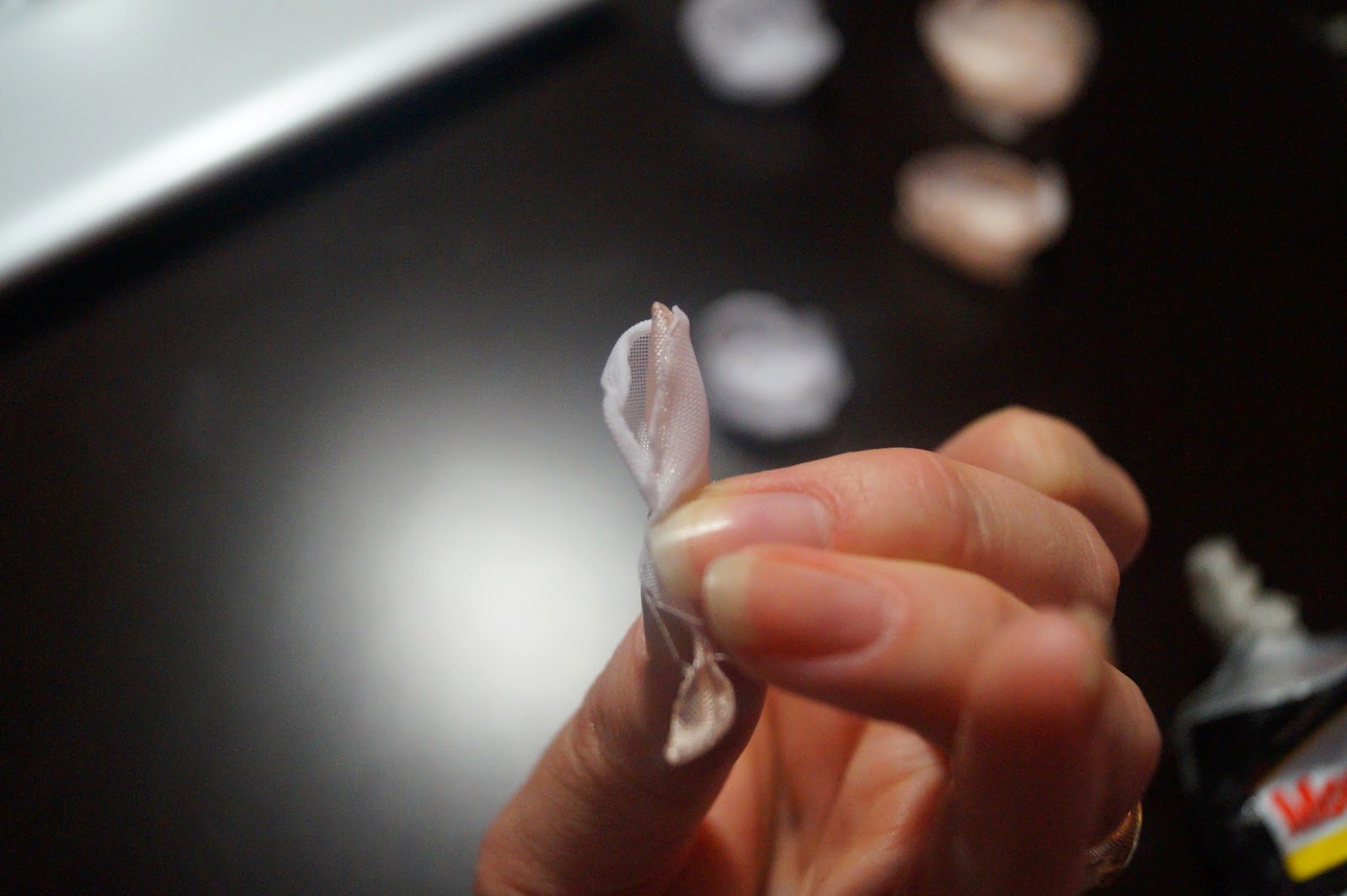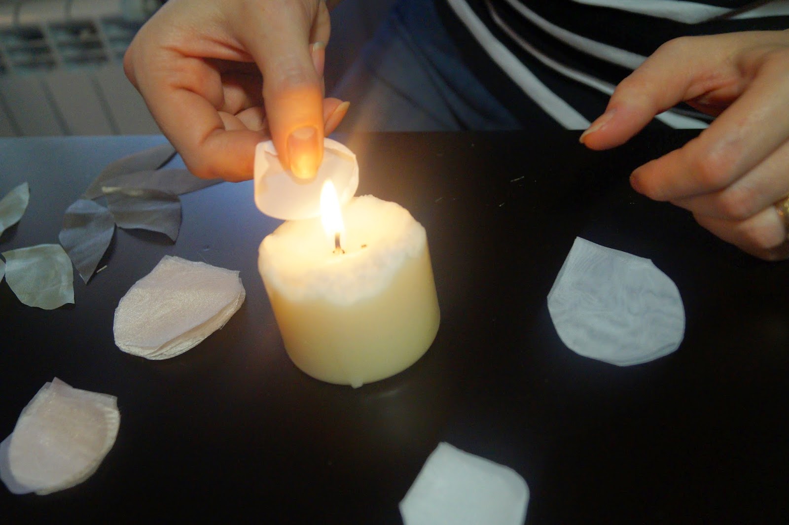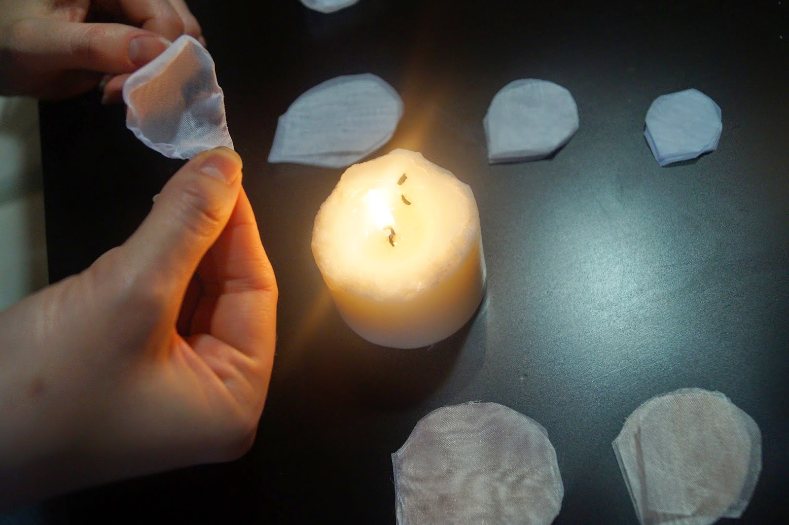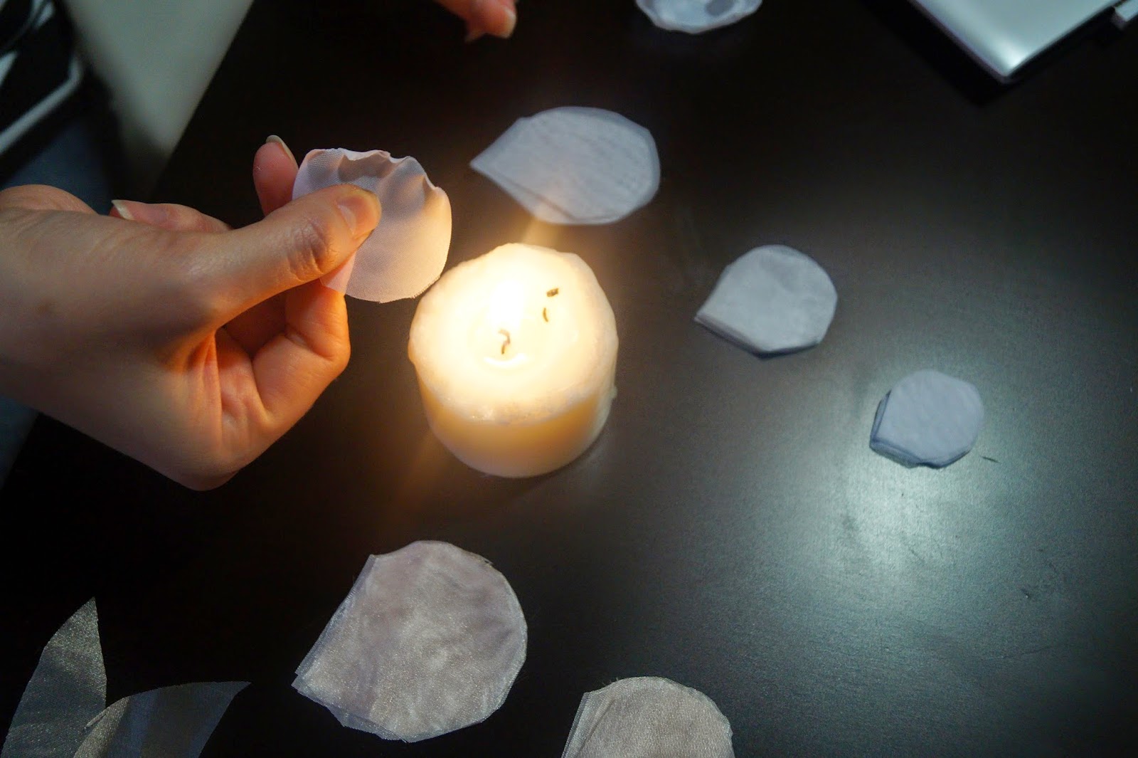 4)Получившиеся "медузки" оплавляем над горящей свечой. Пламя не должно соприкасаться с тканью, иначе на ткани остается черные оплавленные следы, необходимо найти эту точку самой высокой температуры нагрева, которая находится на уровне 2-4см над свечой. Следите за тем, чтобы в помещении окна были закрыты, малейший сквознячок может усложнить работу!