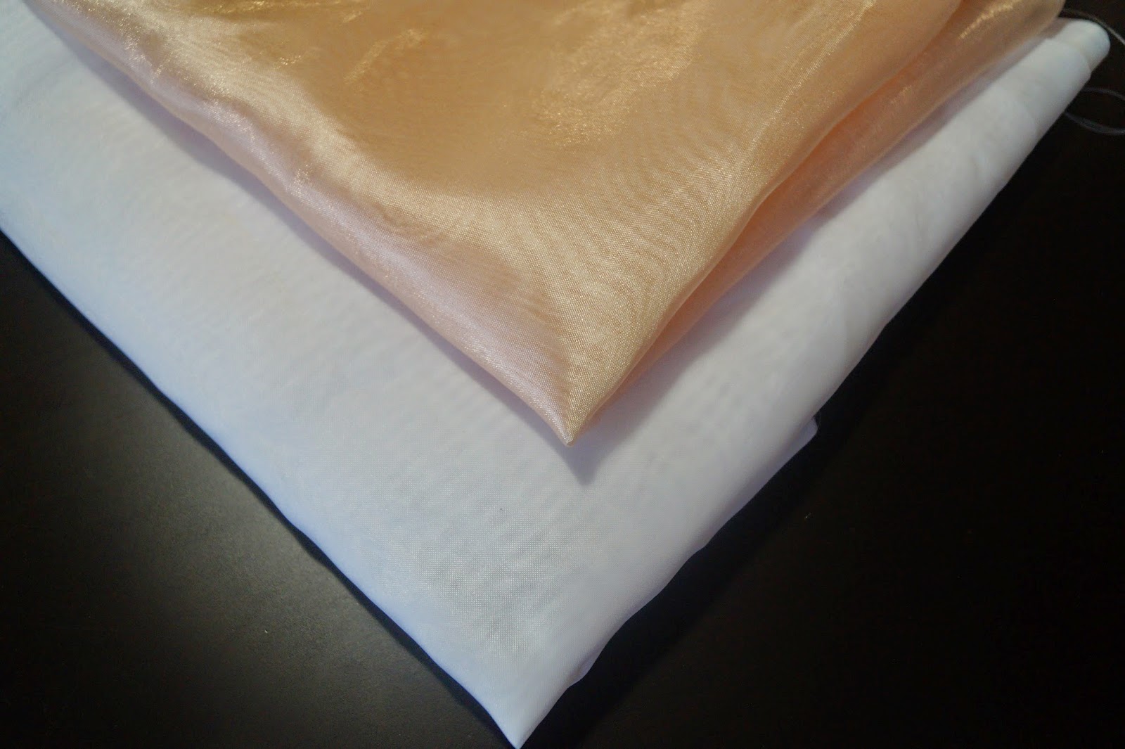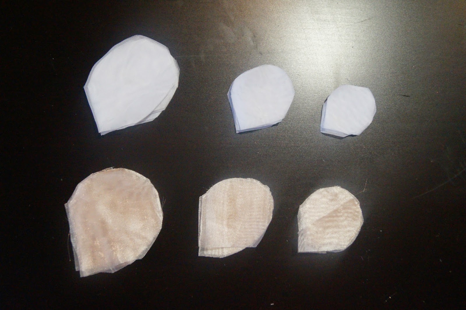 Итак: для лепестков вырезаем квадратики, из белого шифона 6 штук со стороной где-то 5-6см, 6 штук со стороной 4см и 6 штук со стороной 3см. Итого -18 квадратов. Точно так же поступаем и с персиковой органзой. Тоже 18 квадратов. Всего у нас 36 заготовочек квадратиков.