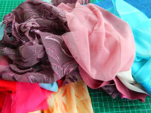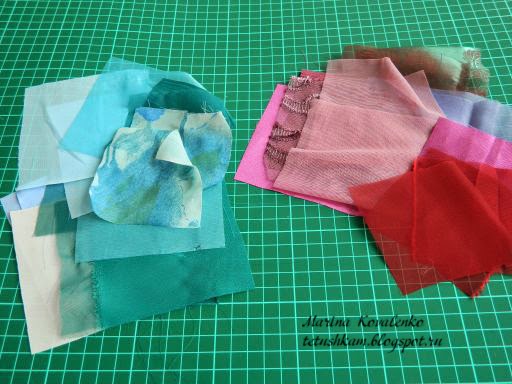 Для начала выгребла залежавшиеся лоскуты органзы, шелка, кружева (когда-то отдавали в магазине тканей много-много разных кусочков). С такими тканями я не работаю, не люблю и не умею...