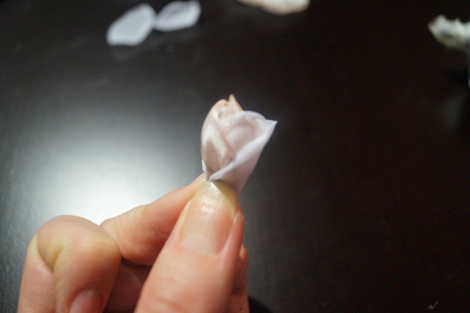Берем самые крупные лепестки,клеим закручивающейся стороной наружу. Заканчиваем сам цветок. Даем ему немного подсохнуть.
