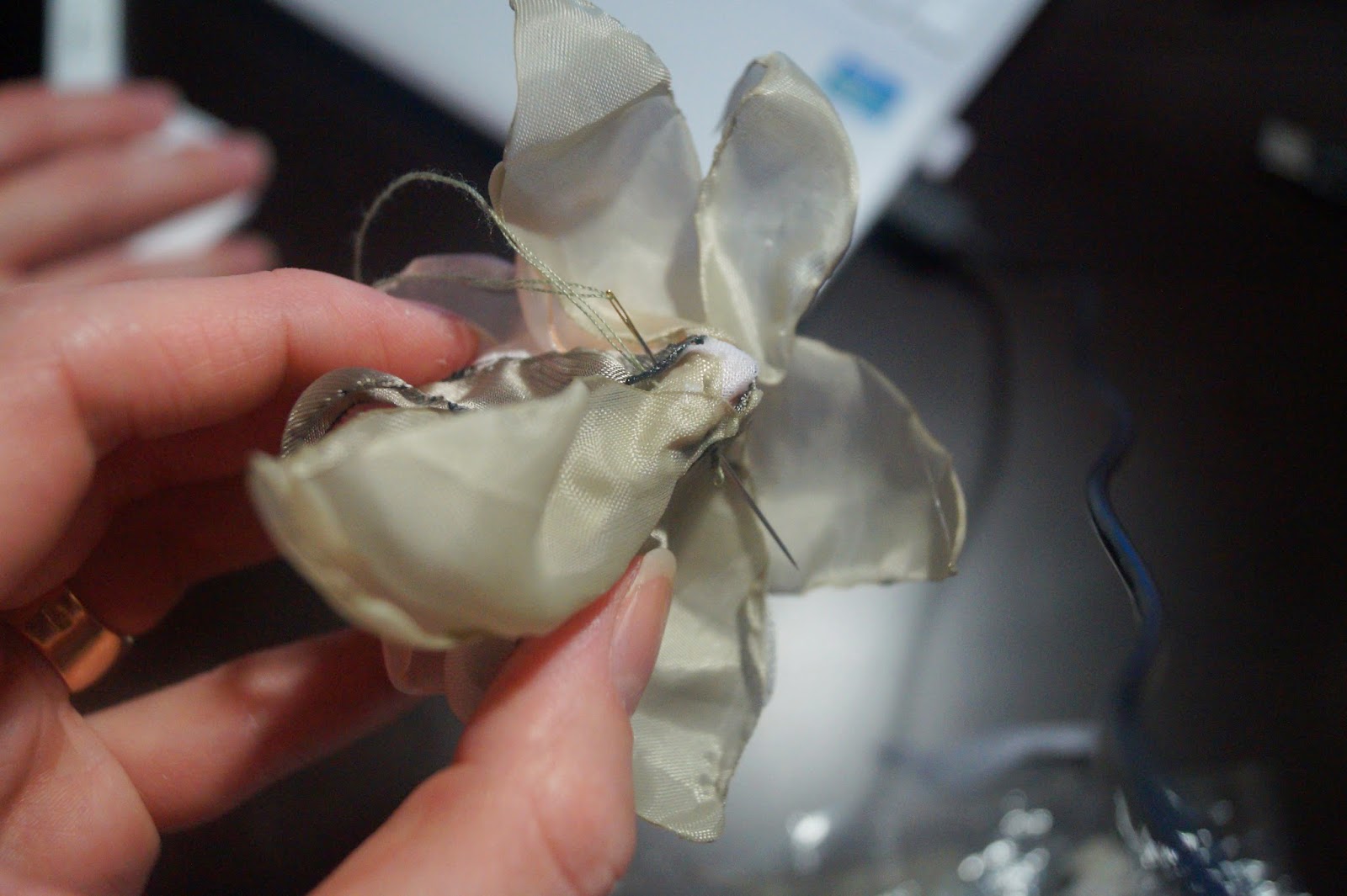 После того, как сделан последний виток, скрепляем цветок с помощью иголки и нитки (вставляем иголку с нижней стороны цветка и прошиваем середину, скрепляя незаметными стежками "боковые лепестки")