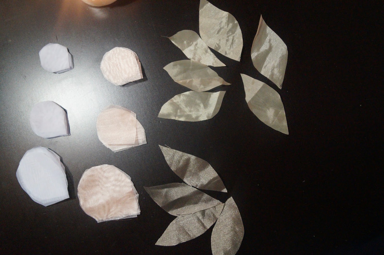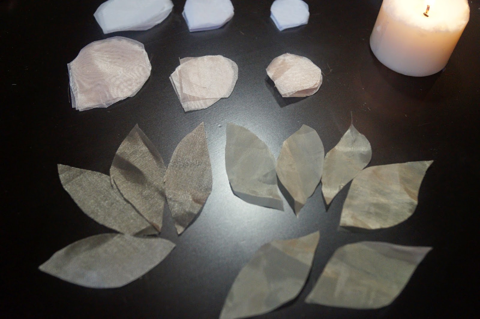 Нам понадобяться: 4 вида тканей: для лепестков - обычный белый тюлевый шифон и бледно-персиковая органза, для листиков органза зеленая и подкладочная ткань оливкового цвета; ножницы, клей момент Кристалл, свеча.