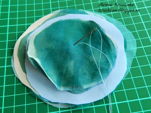 5)Собираем на кружочек все лепестки. Беремся за макушку цветка и плотно прошиваем нижнюю часть цветочка несколькими стежками - так мы стягиваем цветок.