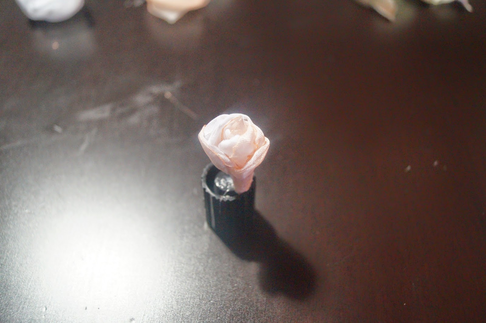 Далее скручиваем цветок по часовой стрелке и капаем на каждом повороте немного клея.