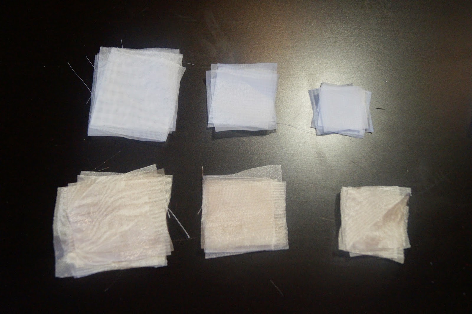 1) Вырезаем/вырываем из органзы 14 квадратов: а)14/14см - 3 шт, б) 10/10см - 4шт