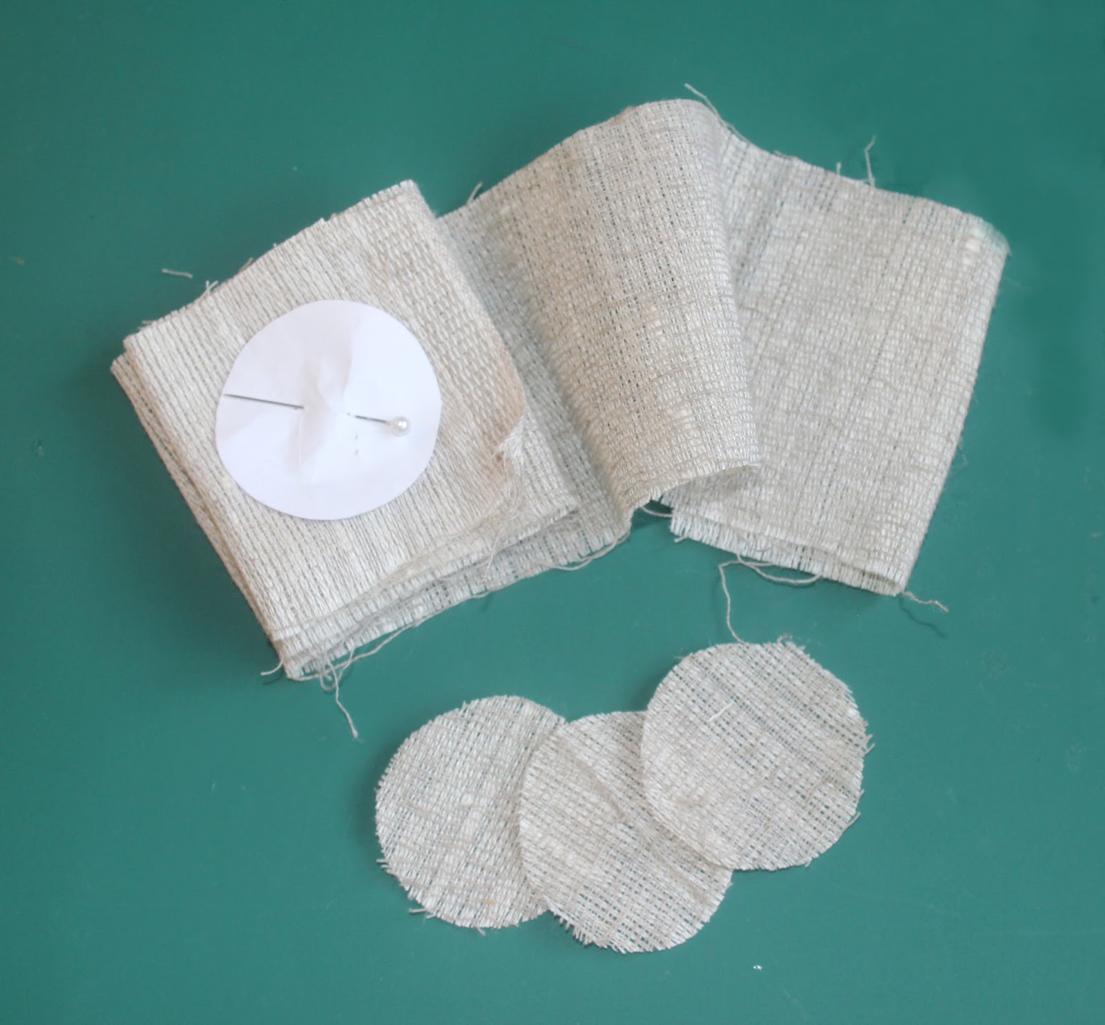 1) Берем полоску из льня шириной 6 см и длинной около 85 см,вырезаем из бумаги шаблон круга диаметром 4,5 см, прикалываем шаблон английской булавкой,чтобы было удобнее вырезать круги из ткани. у нас должно получиться 15 кружочков