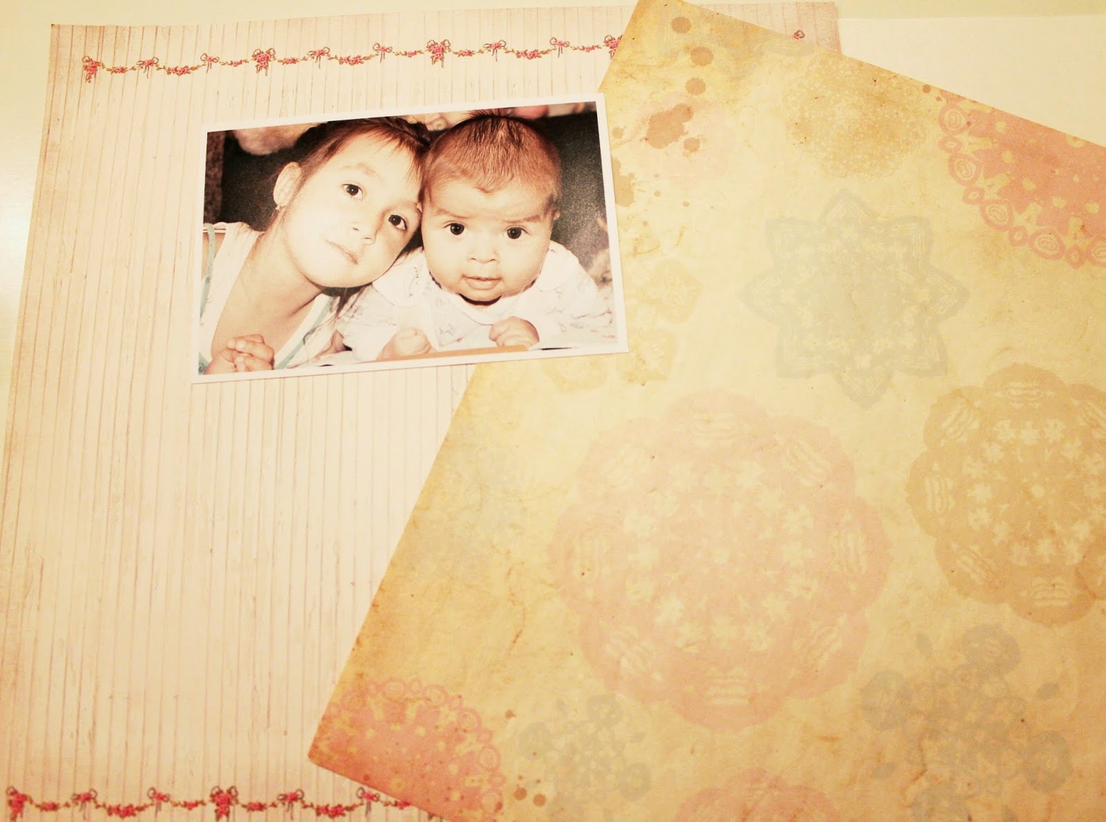 Итак, первым образом подбираем бумагу к фотографиям. Я остановила свой выбор на Скрапберриз и Тильда - эти листы скрапбумаги наиболее четко подчеркивают цвета на фото. Конечно, идеальным вариантом будет подбор скетча, но я решила обойтись моей любимой диагональной композицией, палитра классическая - белый, мятный, розовый.