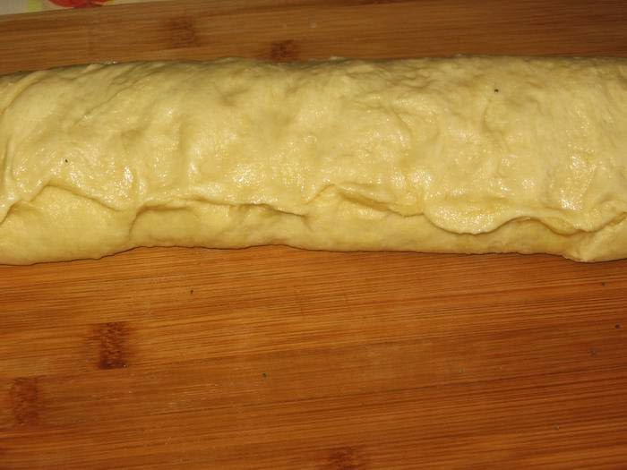 Раскатываем его в пласт площадью примерно 2 альбомных листа. Муку подсыпать не надо!