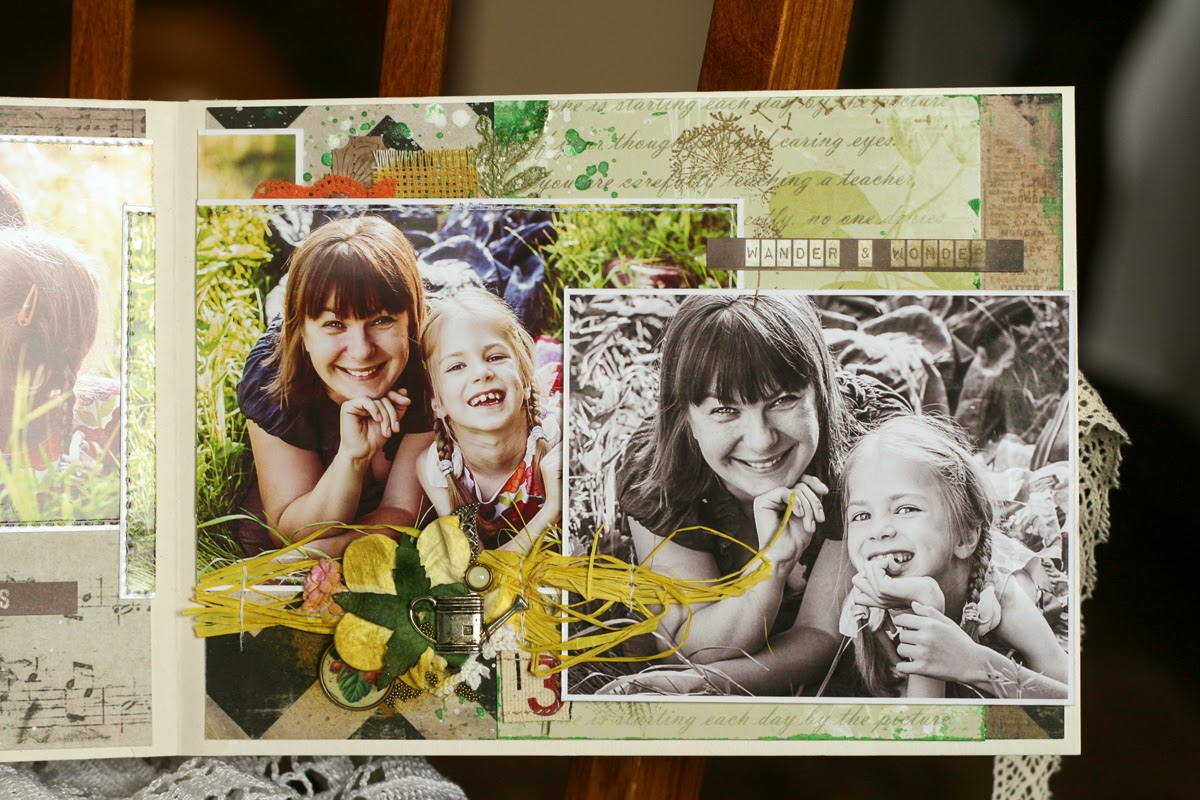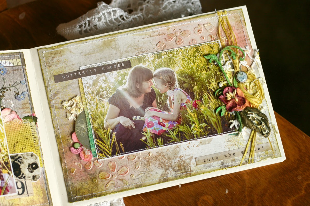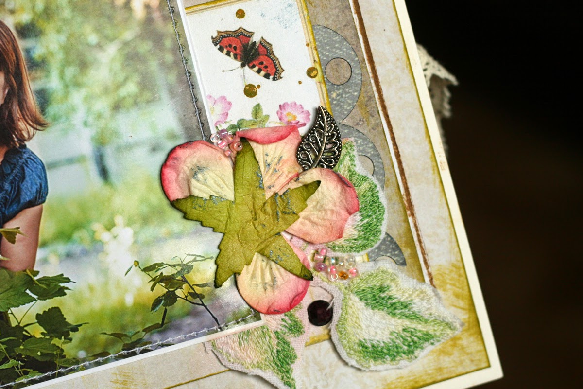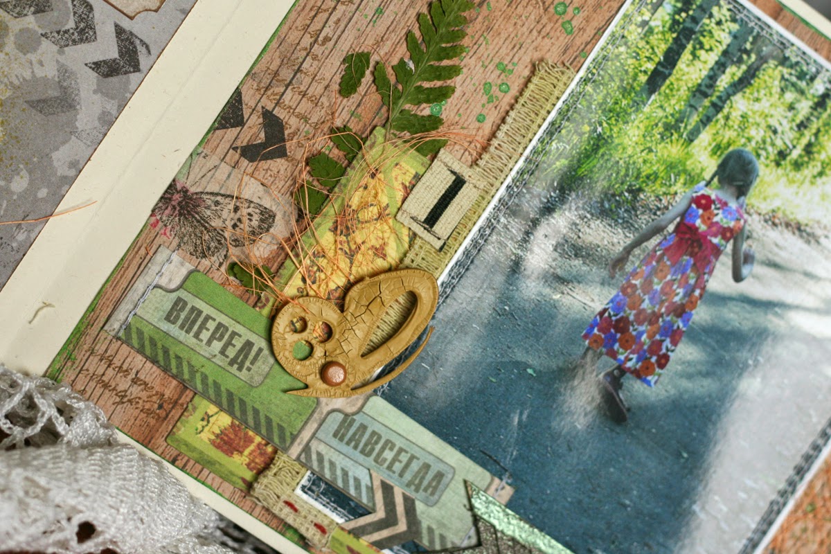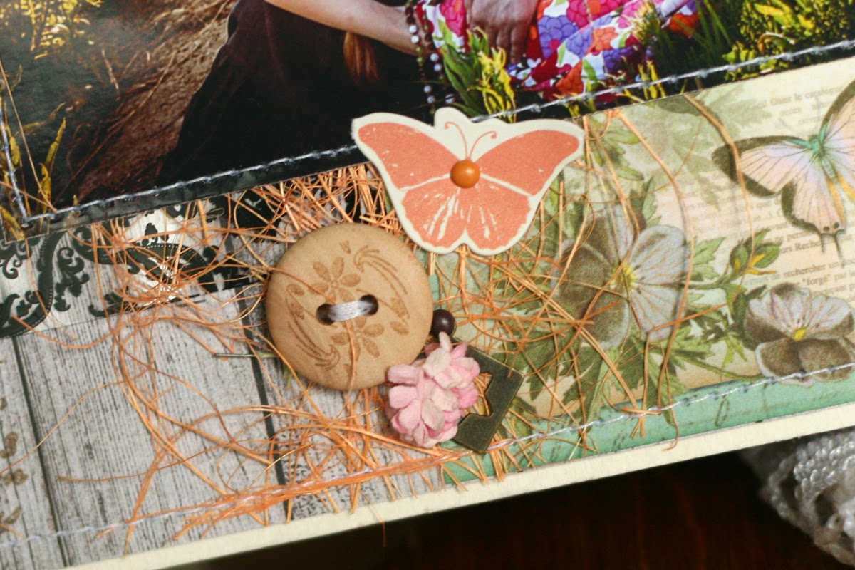 Альбом в основном сделан из бумаги 7 Dots Studio коллекция Nature Walk, которая и дала название альбому - ушел почти весь набор бумаги. Есть немного Kaisercraft и Scrapberryes моя любимая коллекция "Ветер странствий". Так как альбом на тему природы, то и украшения в основном использовала из природных материалов. Например, хлопковое кружево.