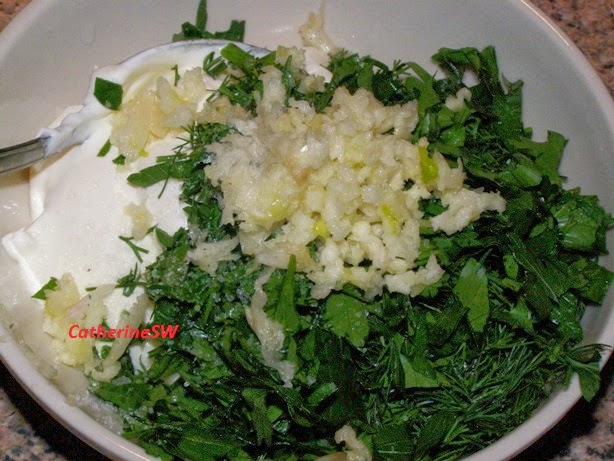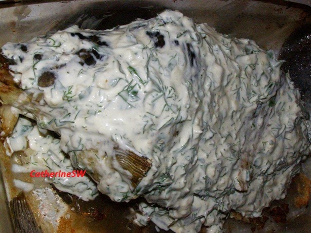 19. Запекаем карпа 30 минут при 200 градусов. Пока карп запекается, приготовим его финальное покрытие)) Сметану смешаем с давленым чесноком, солью, перцем, рубленной зеленью петрушки и укропа