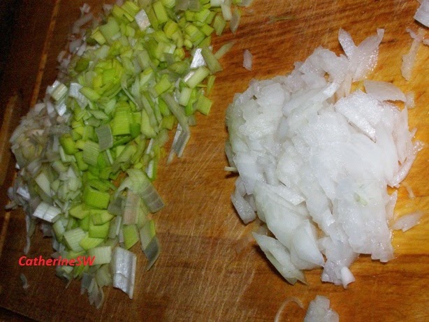 1. Сначала приготовим гарнир. Мелко порежем лук-порей и белый лук