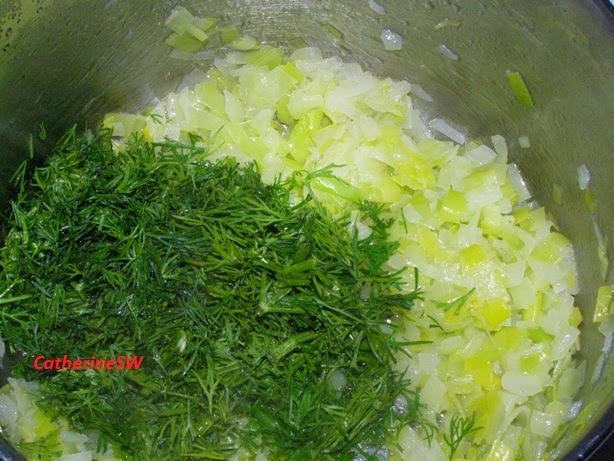 2. На раскаленном растительном масле обжарим лук до мягкости. Жарим на среднем огне минуты 2-4 (колер нам не нужен), добавим мелко порезанный укроп,