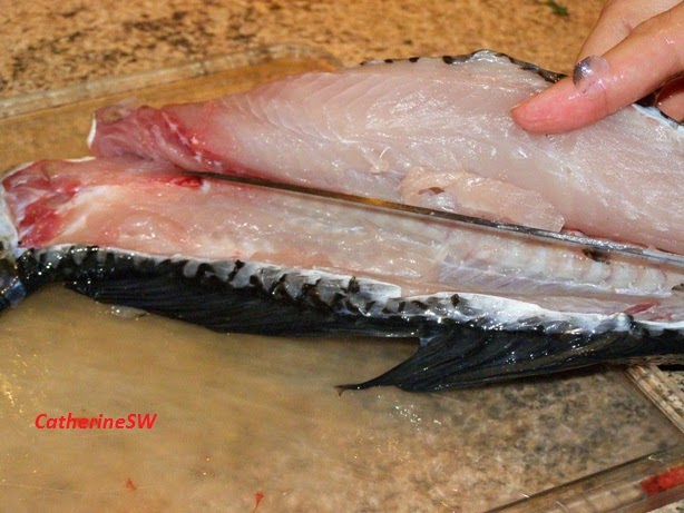 10. Теперь удалим спинной хребет со второй половинки рыбы. Начинаем опять со спины. Подрежем спинной плавник и аккуратно отделим мякоть от кости.