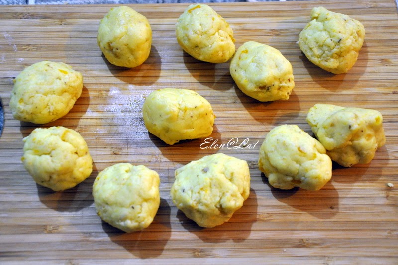 Тесто разделить на равные части, скатать шарики. Примерно 11-13 штучек в зависимости от предполагаемого размера Вашего печенья. у меня получилось 11, где-то 15 см длиной.