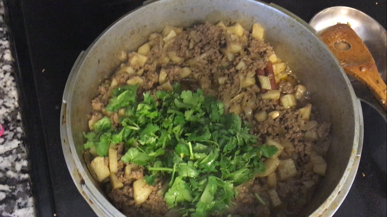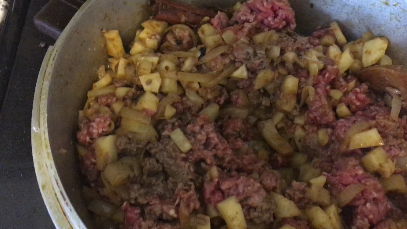 Готовим начинку с картофелем минут 10 под крышкой и потом добавляем фарш