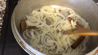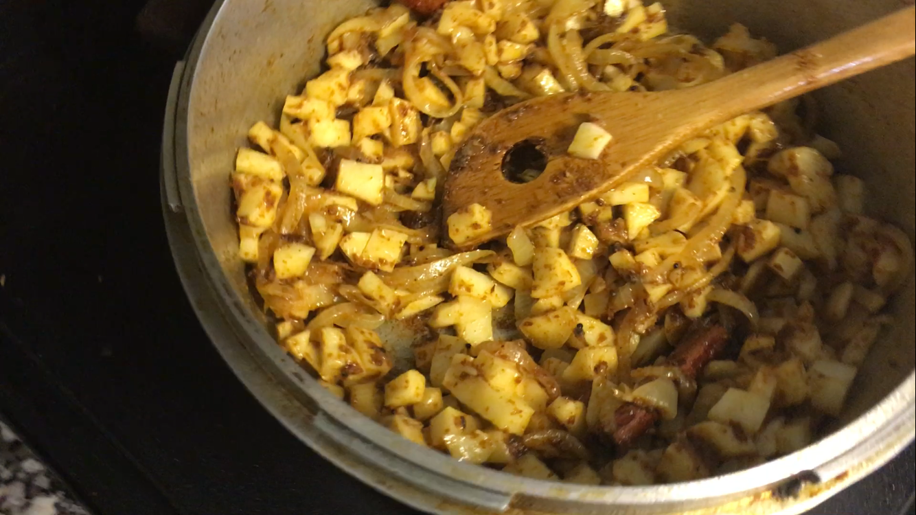 Когда лук станет золотистым, добавим остальные специи: гарам марсалу, паприку, кумин, кари. Чеснок с имбирем перетереть в блендере в нежную пасту и также добавит к луку.