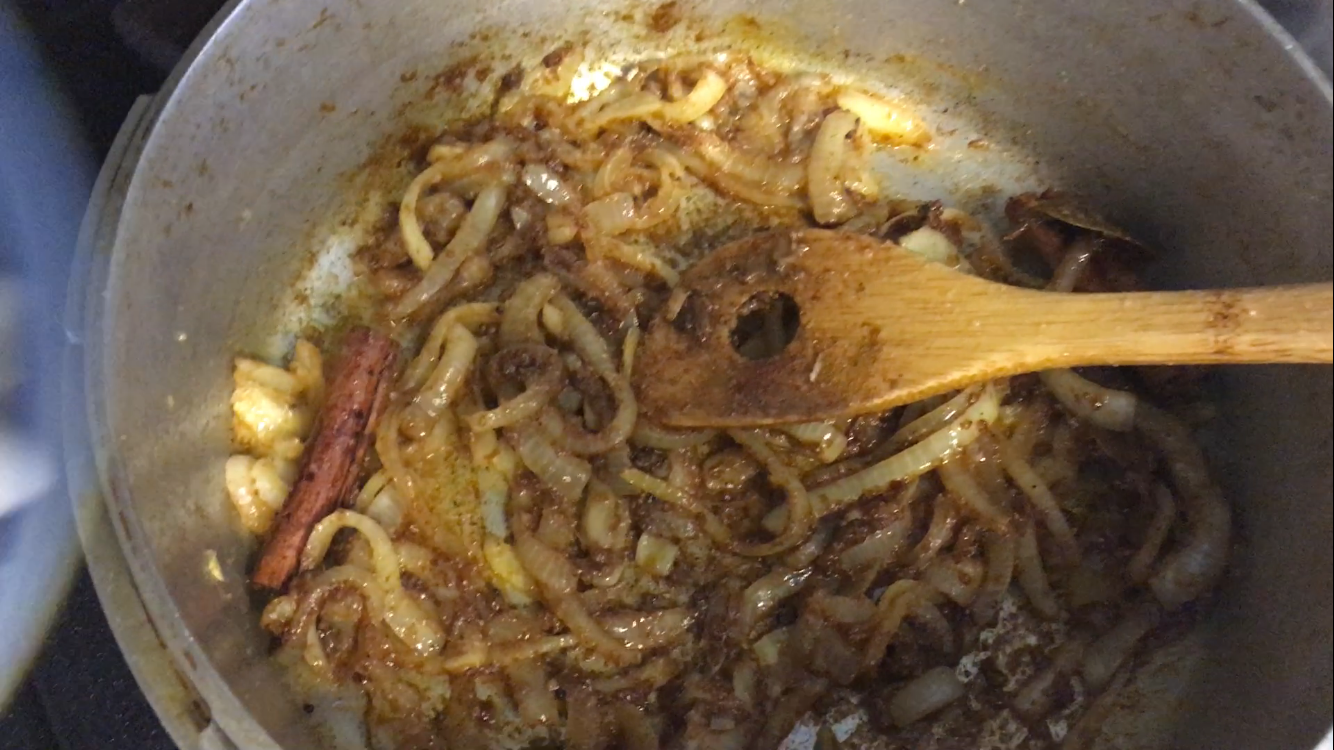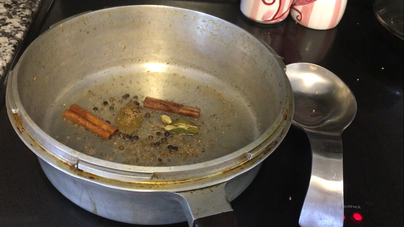 Для начала надо подогреть подсолнечное масло на сковороде и добавить половину наших специй: лавровый лист, кардамон, корицу, чёрный перец. Немного прожарить, что бы специи дали свой аромат.