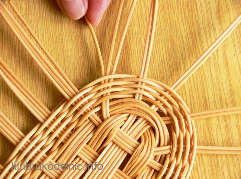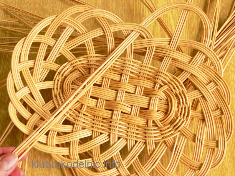 5. Этот способ поочередного плетения повторяем, пока не достигнем нужной ширины дна. В нашем прамере это 8 рядов. К ребрам, разделенным пополам, добавим с каждой стороны по одному прутику. Кончик добавленного прутика нужно заострить, чтобы его было легче спрятать в плетение.