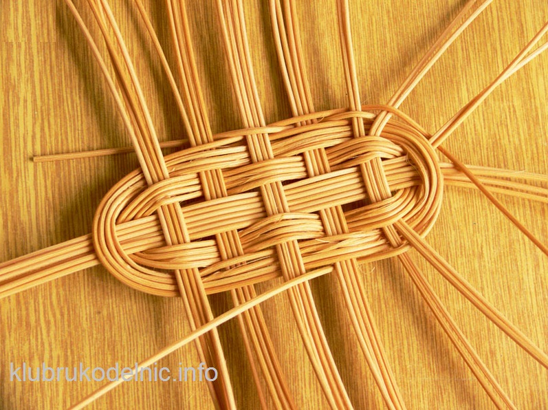 3. Потом протянем снизу два прутика, что достигнем чередующего переплетения. Сделаем четыре ряда тем же способом а после этого начнем разворачивать плетение так, что центральное длинное ребро и крайние короткие разделим пополам и оплетем их. Остальные ребра оставим по четыре веточки.