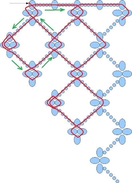 Несколько проб и ошибок привели меня как раз к нарисованной мной схеме, потому что мульт-мастеркласс меня вдохновил, но сильно озадачил рисунком... И я решила облегчить себе жизнь, увеличив размер центровых бусинок, а так же сделав их относительно контрастными...