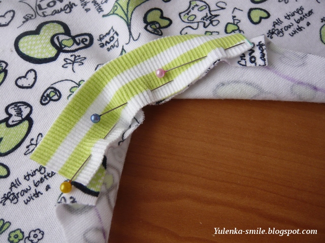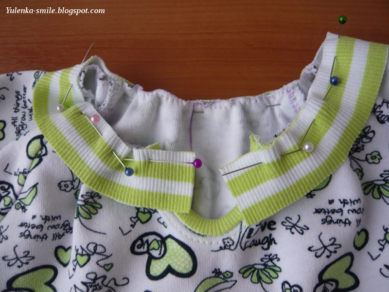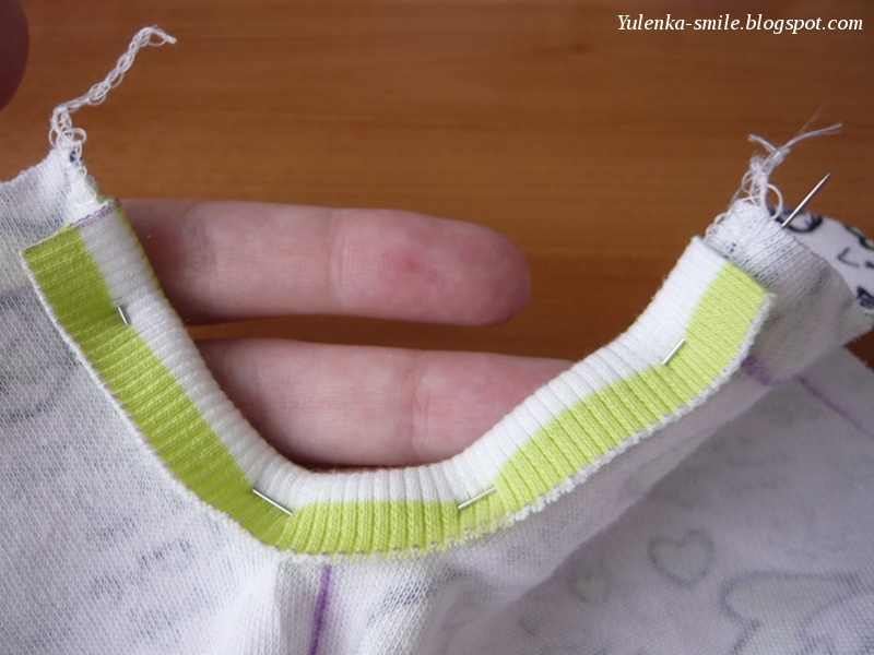 Присбарием горловину до длины 34 см (для размера 104), выкраиваем обтачку длиной 34 + 2 + 2 = 38 см (припуски по 2 см, чтобы потом было удобно их загибать) и прикалываем ее по краю горловины, потом пришиваем (обработка такая же, как на "капельке"):