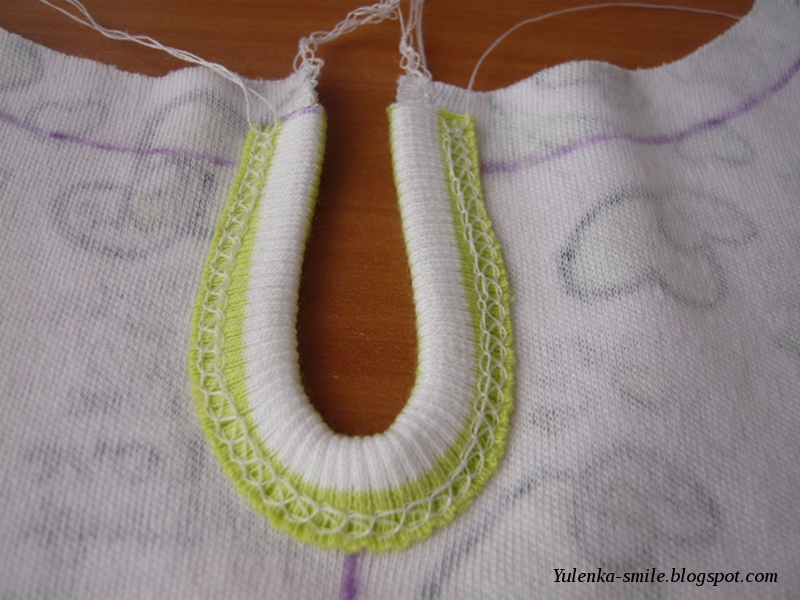 3.1. Прокладываем строчку (длина стежка примерно 4 мм) по краешку горловины, но не забывая, что строчить нужно не на припуске, т.к. мы его потом отрежем (я забылась сначала и прострочила по припуску, поэтому потом распарывала :) ):