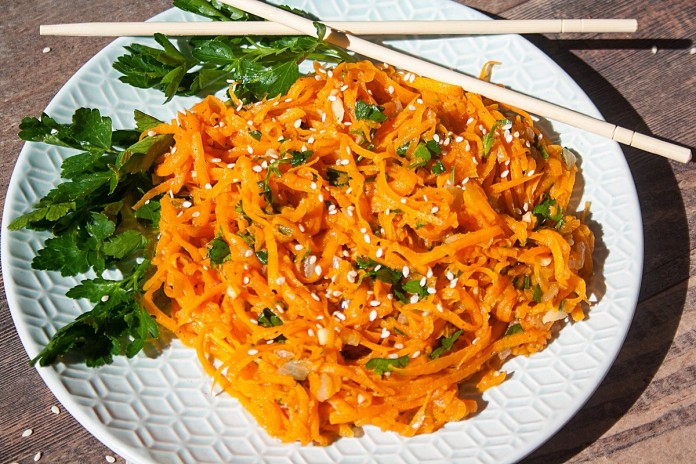 Тыква по-корейски готова. Приятного аппетита! Перед подачей на стол посыпаем салат кунжутными зернами.
