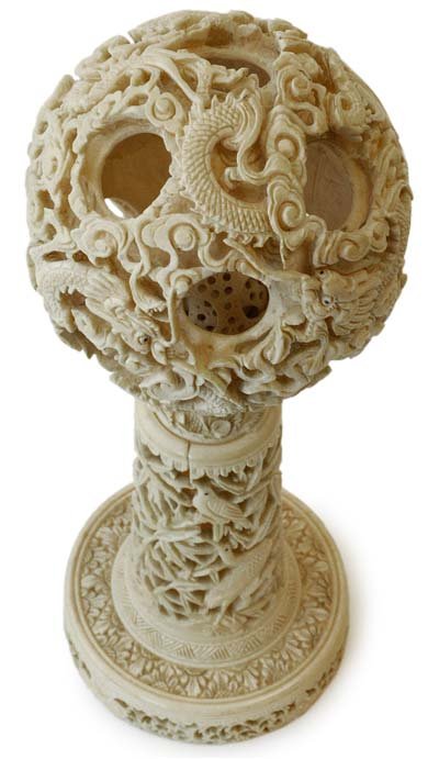 Íàñòîÿùåé æåì÷óæèíîé ñðåäè ïðî÷èõ øåäåâðîâ, âûïîëíåííûõ èç ñëîíîâîé êîñòè, ïðèçíàíû «ðåøåò÷àòûå øàðèêè âíóòðè øàðèêîâ» . Ïåðâûì øàãîì â èçãîòîâëåíèè ýòîãî ÷óäà ÿâëÿåòñÿ ïðåâðàùåíèå êóñêà êîñòè â èäåàëüíûé øàð, ïîñëå ÷åãî â íåì íà íåîáõîäèìîì ðàññòîÿíèè ïðîñâåðëèâàþòñÿ íåñêîëüêî îòâåðñòèé êîíè÷åñêîé ôîðìû, ÷üè âåðøèíû ñõîäÿòñÿ òî÷íî â öåíòðå øàðà.