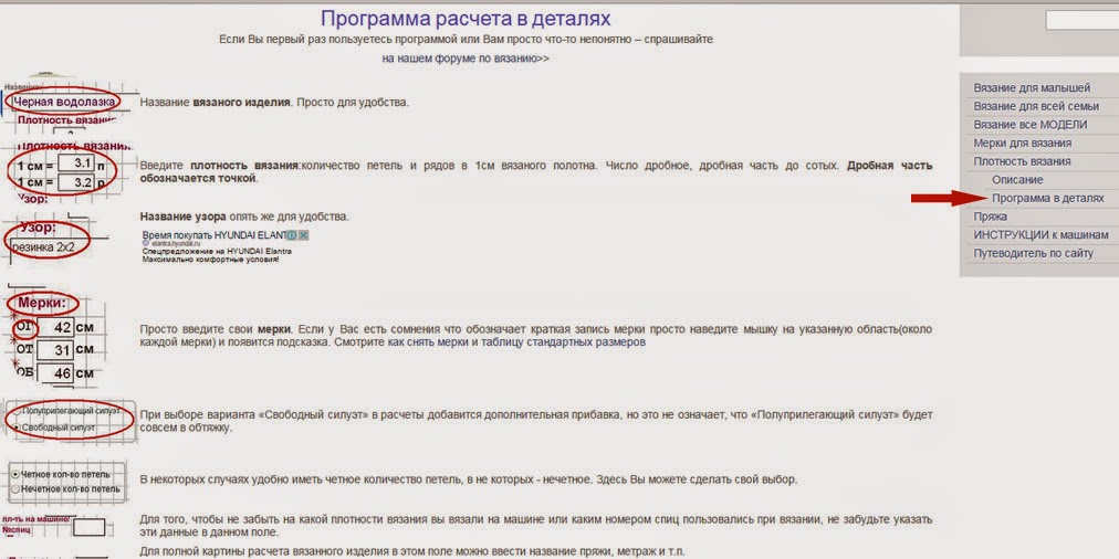 Создатели сайта и программы проделали большую работу, составив максимально полное руководство для пользователей. Если что-то осталось для вас неясным, детально познакомиться с нюансами ввода данных и принципами построения можно, зайдя в меню "Описание" (отмечено на скриншоте красной стрелкой) и "Программа в деталях" (см. следующий скриншот) - здесь описано каждое поле в окне ввода данных, что очень удобно.