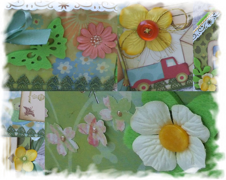 Цветики PM, фетровые цветики и бабочки из салфетки под горячее вырезала, дырокольные листики (спасиб Оксана), шикарная бабочка вытесненная на машинке (спасиб Nata64) и украшенная полужемчужинками -рисинками...